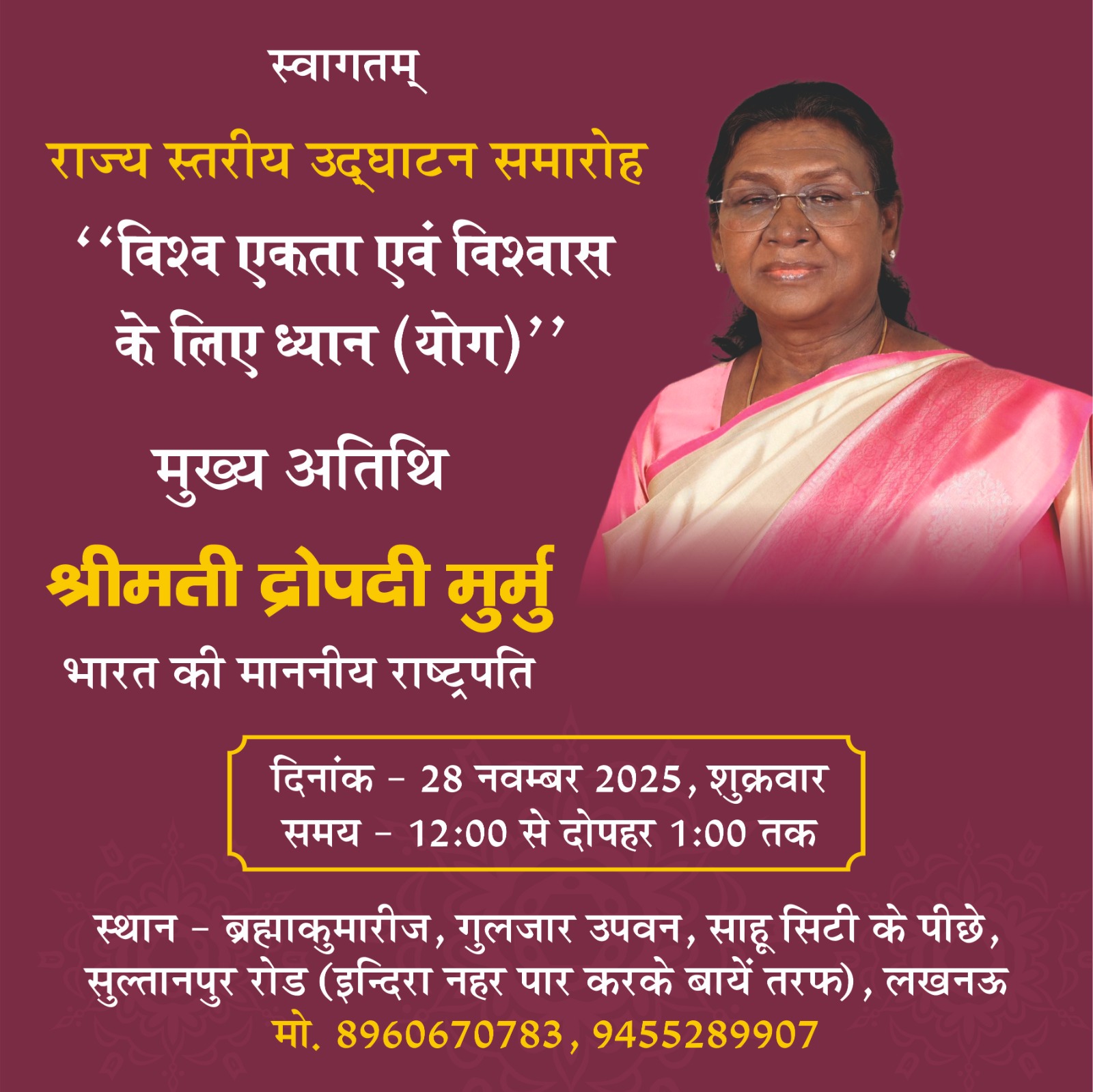 लखनऊ – दिनांक 28 नवम्बर, 2025 को राजयोग प्रशिक्षण केंद्र (गुलजार उपवन) में “विश्व एकता और विश्वास के लिए ध्यान (योग)” विषय पर आयोजित कार्यक्रम में महामहिम राष्ट्रपति भारत श्रीमती द्रौपदी मुर्मु जी (मुख्य अतिथि), राज्यपाल उत्तर प्रदेश श्रीमती आनन्दीबेन पटेल जी, एवं मुख्यमंत्री उत्तर प्रदेश श्री योगी आदित्यनाथ जी, अतिरिक्त महासचिव, ब्र.कु. मृत्युंजय भाई जी, न्यायविद प्रभाग के राष्ट्रीय समन्वयक डॉ ब्र.कु. नथमल भाई जी एवं उप क्षेत्रीय संचालिका, लखनऊ ब्र.कु. राधा बहन।